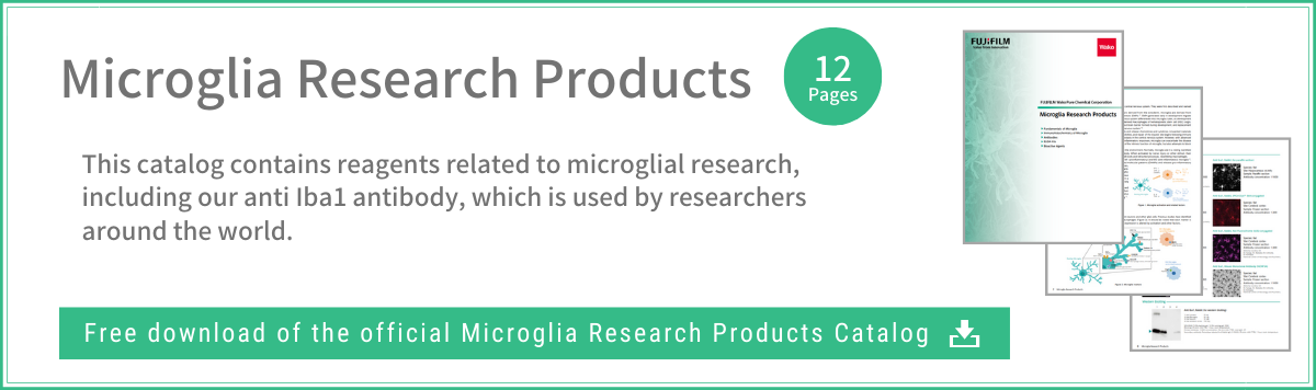 Iba1 (Ionized calcium-binding adapter molecule1) is used as a microglial marker because it is expressed specifically in microglia in the central nervous system. In peripheral tissues, it is expressed in macrophages and is also known as AIF-1. Fujifilm Wako's "Anti Iba1, Rabbit (for immunocytochemistry)" (Product Number 019-19741) is used by researchers all over the world as a standard for microglia marker antibody. In addition, Fujifilm Wako has also developed "Anti Iba1, Rabbit Monoclonal Antibody (6A4), recombinant" (Product Number 018-28523), which has the same performance as Anti Iba1, Rabbit (for immunocytochemistry).