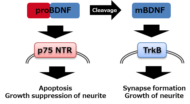 BDNF is expressed as precursor BDNF (proBDNF), transported to the site of secretion, and processed to yield mature BDNF (mBDNF).6) It was previously considered that the precursor, proBDNF, had no physiological function, but it has been recently revealed that it has a completely different physiological function from that of mBDNF. mBDNF induces long-term potentiation (LTP) through TrkB to promote neurogenesis and neurodevelopment. On the other hand, proBDNF induces long-term depression (LTD) through a low-affinity receptor, p75NTR, to promote nerve apoptosis (Figure 1).7) This change in the effect due to the difference in processing suggests the presence of a highly complicated control mechanism of BDNF on the nerve system. Therefore, a method to accurately measure mBDNF is necessary to reveal the mechanisms of various psychiatric diseases.