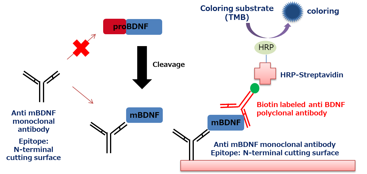 Fujifilm Wako succeeded in the development of ELISA kits that can specifically detect mBDNF using an antibody recognizing the N-terminal side of mBDNF.