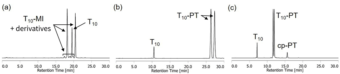 Figure 2 HPLC analysis of ONs released from T10-loaded (a) MI Linker CPG (R=Me) and (b)(c) PT Linker CPG after treatment with 28% NH3 (aq.) at rt for 2 h. HPLC analytical conditions: (a) 5-15% (b) 8-18% (c) 5-50% Acetonitrile in 0.1 M TEAA (pH 7.0) over a linear gradient for 30 min.