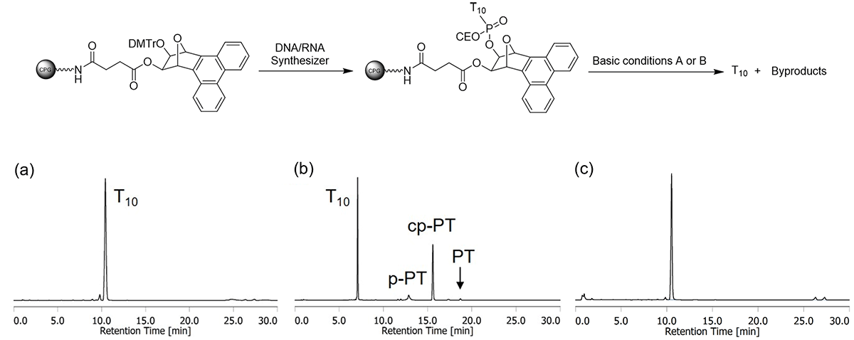 Figure 3 HPLC analysis of ONs released from T10-loaded PT Linker CPG under Basic conditions A and B. Basic condition A: (a),(b) 28% NH3 (aq.) at 55℃ for 8 h; Basic condition B: (c) AMA at 65℃ for 1 h. HPLC analytical conditions: (a),(c) 8-18% (b) 5-50% Acetonitrile in 0.1 M TEAA (pH 7.0) over a linear gradient for 30 min.