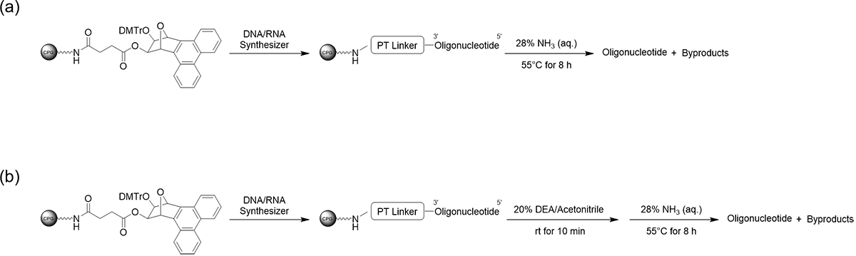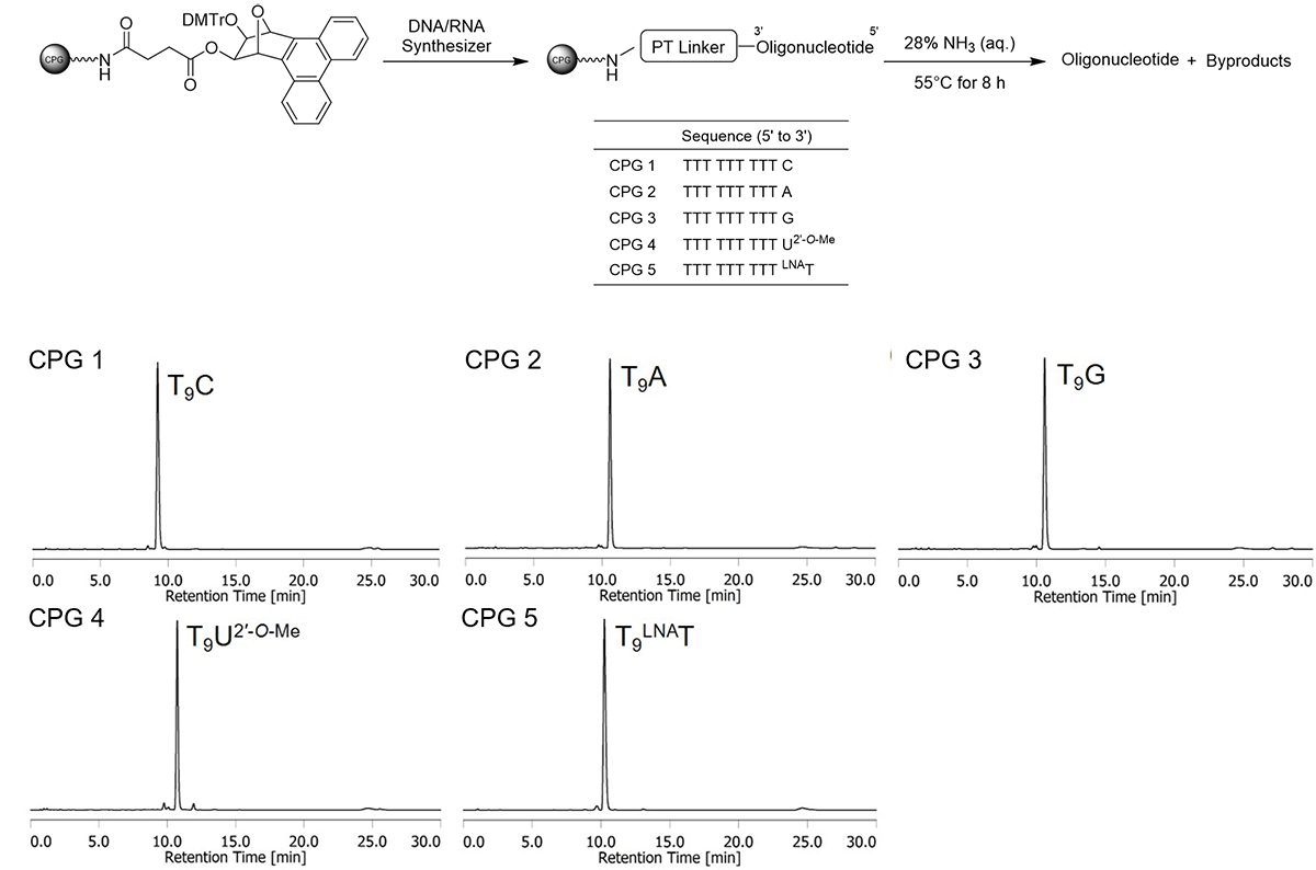 The Phenanthrene-type Linker (PT Linker) is a universal linker for oligonucleotide synthesis. This linker consists of a bicyclic 1,2-diol structure containing a phenanthrene moiety and a succinyl unit that connects the solid support to the phenanthrene via an amide bond. Its high lipophilicity and UV-detectable phenanthrene scaffold facilitate easy separation of the targeted oligonucleotide from linker-derived impurities. 1)