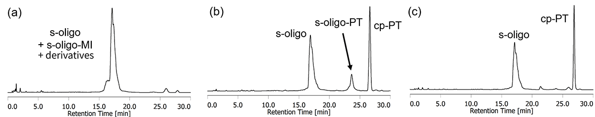 Figure 5 HPLC analysis of ONs released from s-oligo-loaded (a) MI Linker CPG (R=Me) and (b)(c) PT Linker CPG under Basic conditions A and B. Basic condition A: (a),(b) 28% NH3 (aq.) at 55℃ for 3 h; Basic condition B: (c) 28% NH3 (aq.) at 55℃ for 8 h. HPLC analytical conditions: 5-25% Acetonitrile in 0.1 M TEAA (pH 7.0) over a linear gradient for 30 min.