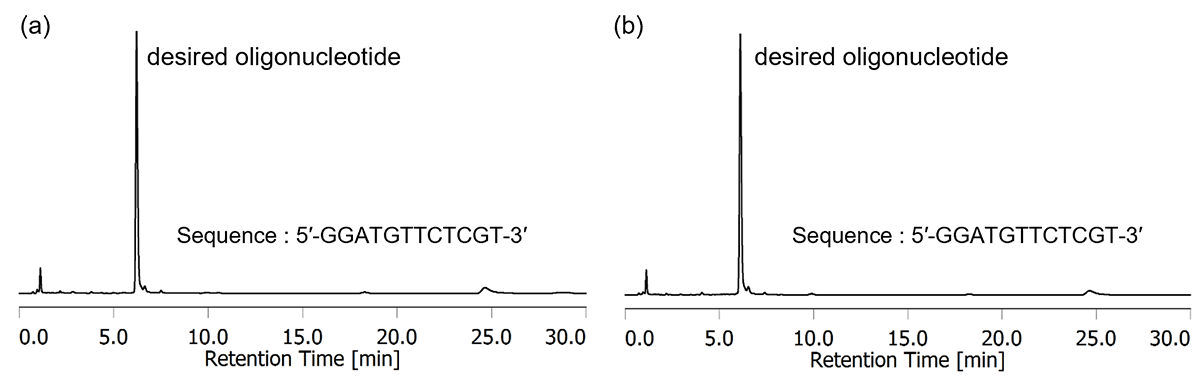 Figure 6 HPLC analysis of ONs released from oligo-loaded PT Linker CPG under Basic conditions (a) 28% NH3 (aq.) at 55℃ for 8 h and (b) 20% Diethylamine (DEA) in Acetonitrile at rt for 10 min then 28% NH3 (aq.) at 55℃ for 8 h. HPLC analytical conditions: 8-18% Acetonitrile in 0.1 M TEAA (pH 7.0) over a linear gradient for 30 min.