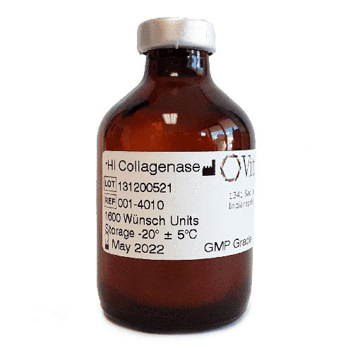 GMP Grade Animal Origin Free (AOF) rCollagenase HI is an aseptically prepared, lyophilized mixture of purified recombinant collagenase C1 (ColG) and purified recombinant collagenase C2 (ColH) from engineered E. coli.