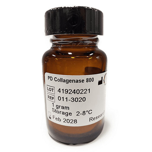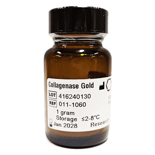 Collagenase Gold is low protease, purified defined collagenase product from Clostridium histolyticum that can be used for isolating cells from tissue or recovering adherent cells after in vitro culture.
