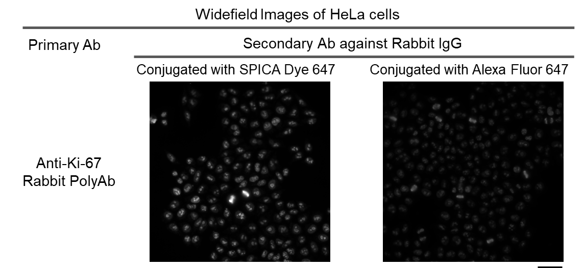 Anti Rabbit IgG, Goat, SPICA Dye™ 647 Conjugated is a secondary antibody conjugated with SPICA Dye™, a novel ultra-photostable fluorescent dye developed by Fujifilm. Compared to conventional fluorescent dyes, SPICA Dye™ is significantly more resistant to photobleaching. This antibody is suitable for both immunohistochemistry and immunocytochemistry.