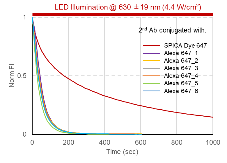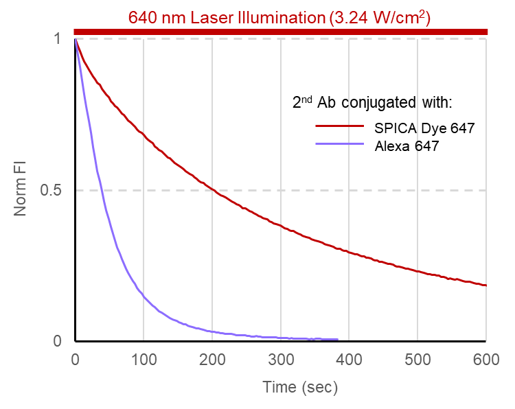 The SPICA Dye™ 647-conjugated antibody demonstrated greater photostability than the antibody conjugated with the competitor’s fluorescent dye.