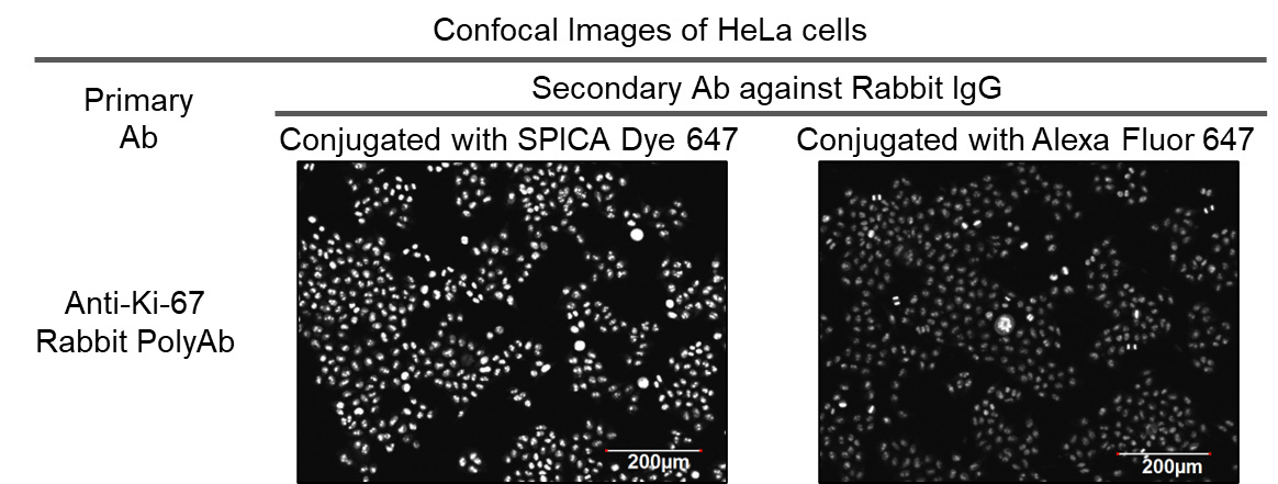 - Anti Rabbit IgG, Goat, SPICA Dye™ 647 Conjugated (This product) 1:500 in 0.3% Triton X-100/PBS (RT, 2 hours)