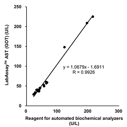 A high correlation was confirmed between the measured values of LabAssay™ AST (GOT) and the reagent for automated biochemical analyzers