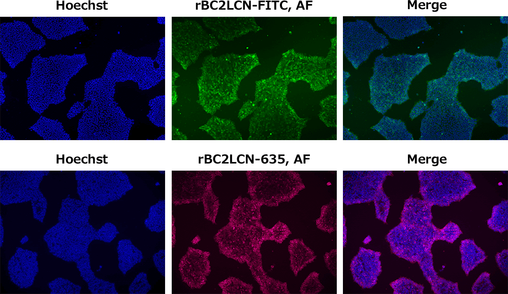 Human iPS cell line 201B7 was cultured with rBC2LCN-FITC, AF at 1/1,000, 1/100, and 1/50 of the culture medium volume. Cell proliferation was comparable to the untreated control at all concentrations of rBC2LCN-FITC, AF. In addition, cell morphology remained similar between treated and untreated cells.