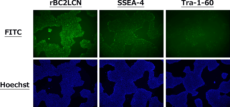 Human iPS cell line 201B7 was stained without fixation using rBC2LCN, SSEA-4, and Tra-1-60. Images were acquired 2 hours after staining. Compared with staining using the other antibodies, rBC2LCN enabled clearer visualization of the cells.