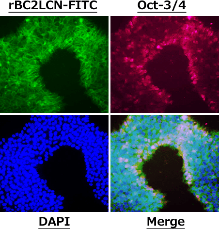 Human iPS cell line 201B7 was fixed with paraformaldehyde and stained with rBC2LCN, Oct3/4, and DAPI. Compared with live-cell staining, the cells were stained more clearly.