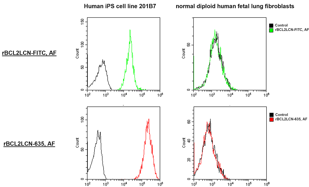 Human iPS cell line 201B7 and normal diploid human fetal lung fibroblasts were stained with rBC2LCN-FITC, AF or rBC2LCN-635, AF and analyzed by flow cytometry. The results show that undifferentiated human iPS cells can be distinguished from differentiated human diploid fibroblasts.