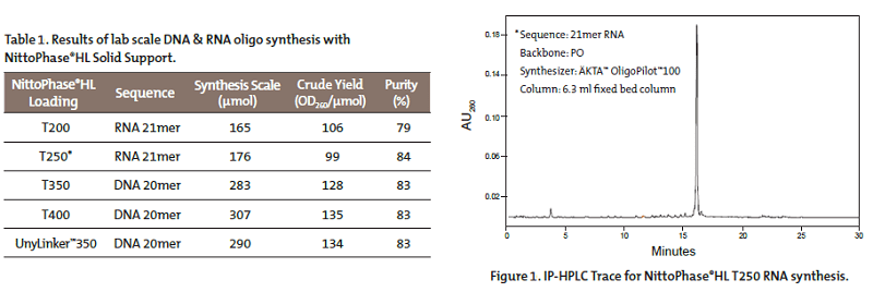 Table 1. Results of lab scale DNA & RNA oligo synthesis with NittoPhase™ HL Solid Support.