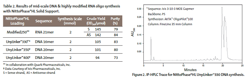 Table 2. Results of mid-scale DNA & highly modified RNA oligo synthesis with NittoPhase™ HL Solid Support.