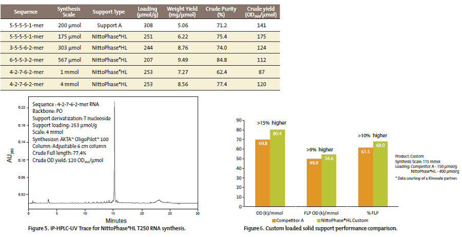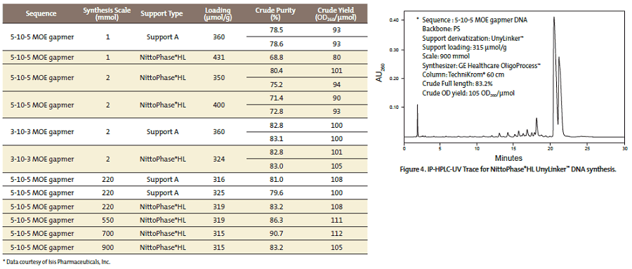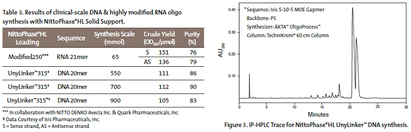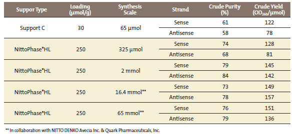 Table 3. Results of clinical-scale DNA & highly modified RNA oligosynthesis with NittoPhase™ HL Solid Support.