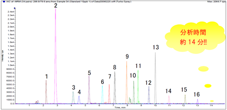 LC/MS/MS Chromatogram(3種有機ふっ素化合物混合内部標準液+7種有機ふっ素化合物混合内部標準液)