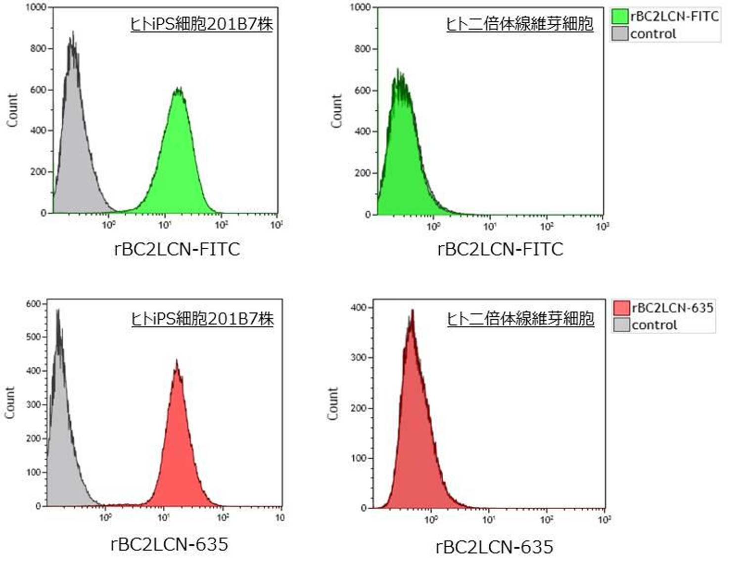 rBC2LCN-FITCおよびrBC2LCN-635を用いてヒトiPS細胞201B7株とヒト正常二倍体線維芽細胞を染色し、フローサイトメトリーに供した。結果、未分化であるヒトiPS細胞と分化したヒト二倍体線維芽細胞を分離できた。