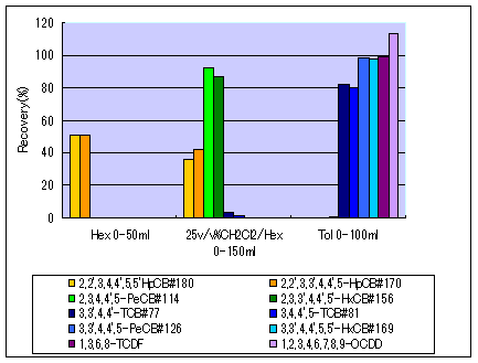 - 試料1 mL (Co-PCB14種各10 ng/mL、1,3,6,8-TCDFおよびOCDD各15 ng/mLヘキサン溶液) を本製品の上層にチャージする。