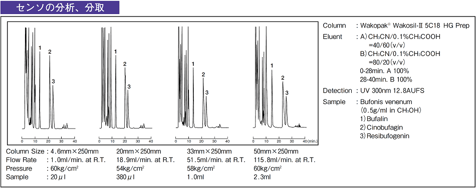 このように、同一の充塡剤で内径の異なる カラムのペアが入手できる場合には、容易にスケールアップを行うことが可能です。