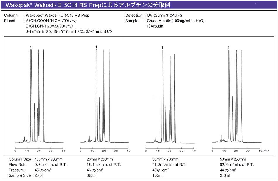 例として、 Wakopak® Wakosil®-II 5C18RS Prepを使用した、アルブチンの分取例を下記に示しました。Wakopak® Wakosil®-II Prepシリーズは粒子径の大きい(約5 μm)充填剤を用いる為、流速を上げても圧力は低く抑えられ、また内径4.6 mmから50 mmまで分取スケールに合わせ適切なカラムを選択いただけます。