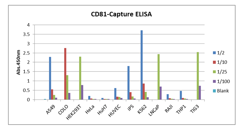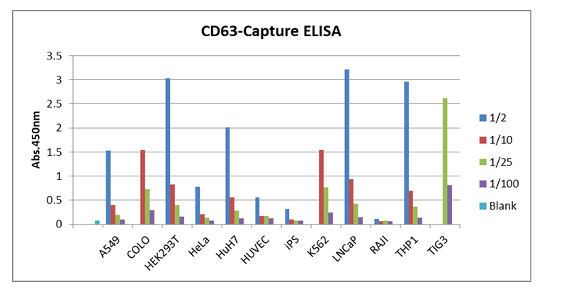 各種細胞培養上清から精製した細胞外小胞1 ngをウェルに添加し、表面マーカーCD9、CD63、CD81を認識する検出一次抗体を用いて各表面マーカー量を本キットで定性比較した。