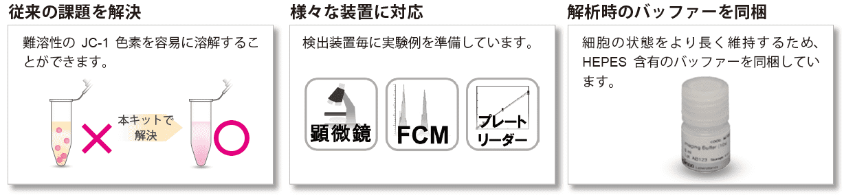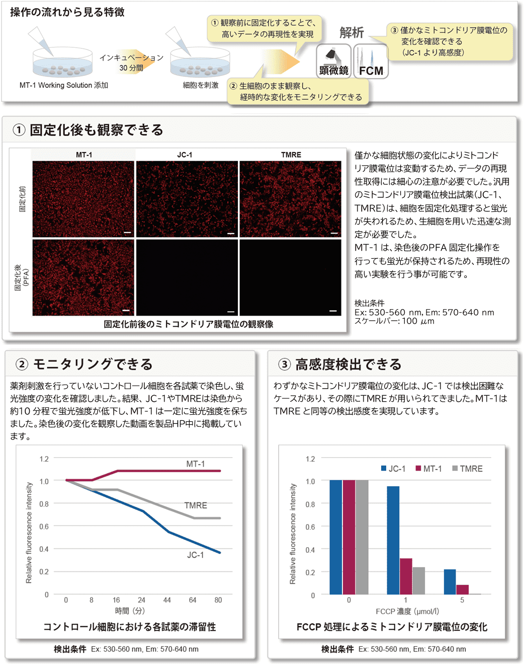汎用のミトコンドリア膜電位検出試薬(JC-1、TMRE)は、細胞を固定化処理すると蛍光が失われるため、生細胞を用いた迅速な測定が必要でした。