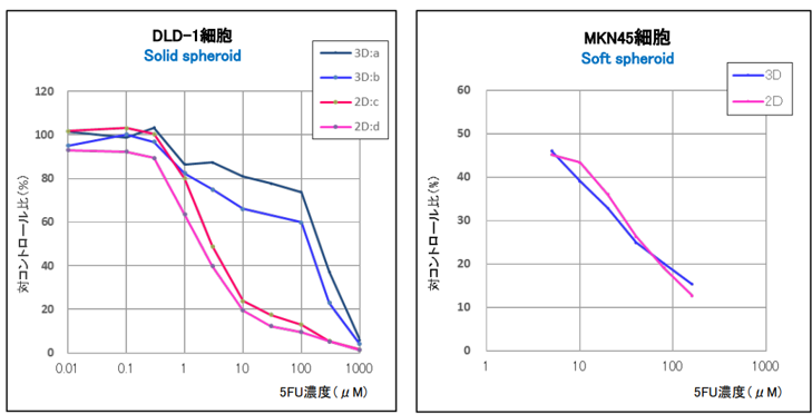 生細胞数の指標となるATP量を測定し、5FU 0μMのサンプルを100%としたときの割合をグラフに示した。結果、 solid spheroidを形成するDLD-1細胞では、2D培養と3D培養で5FUのIC50濃度が100倍程度異なる結果だったのに対し、soft spheroidを形成するMKN45細胞では、2D培養と3D培養での5FU感受性に違いは見られなかった。がん細胞スフェロイドのタイプにより、5FU感受性が顕著に異なる結果となった。