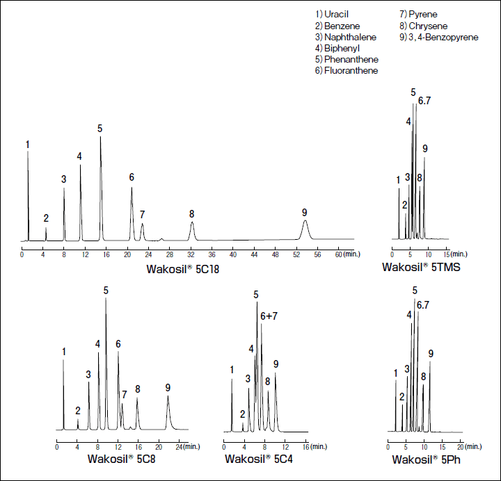 Wakopak® Wakosil® C4-200、C18-200は、カーボン含有率が12%と低いため、保持時間を短縮でき、迅速分析を行うことが出来ます。