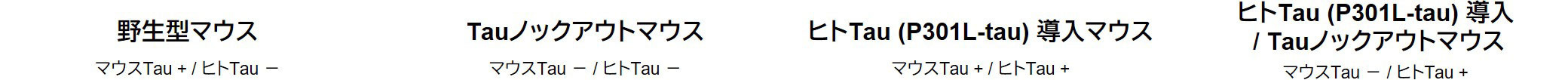 - マウス (野生型、Tauノックアウト、ヒトTau (P301L-tau) 導入、ヒトTau (P301L-tau) 導入/Tauノックアウト)