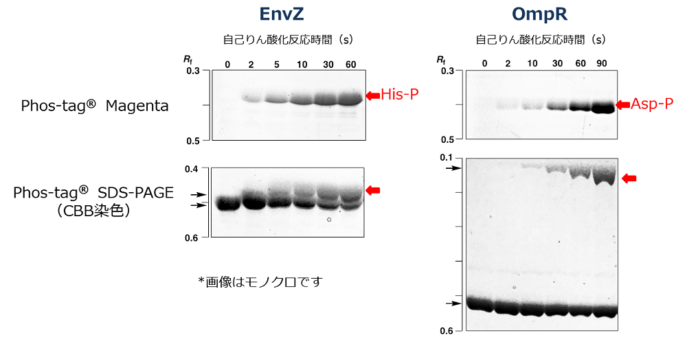 細菌は、ヒスチジンキナーゼであるEnvZからレスポンスレギュレーターであるOmpRに情報が伝達されることにより遺伝子発現を調節しています。自己りん酸化能を有するEnvZと、EnvZによってりん酸化されるOmpRにおいて、ヒスチジンとアスパラギン酸のりん酸化をそれぞれ解析しました。