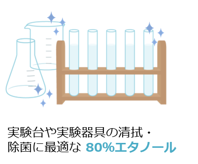 本品は、除菌効果が高いといわれる濃度(77~82 vol%)に調製されたエタノール溶液です。また、メタノール等の不純物を含まない低毒性なエタノール(変性アルコール1)ではない)で、実験機器や実験台の除菌やよごれの清拭など、様々な場面でお使いいただけます。
