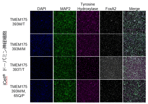 iCell® ドーパミン神経細胞 TMEM175 変異モデルは FUJIFILM Cellular Dynamics 社 (FCDI) が製造するヒト iPS 細胞から分化誘導したドーパミン神経細胞です。パーキンソン病のリスク遺伝子として知られるリソソーム膜陽イオンチャネル TMEM175 について、iCell® ドーパミン神経細胞が持つ TMEM175 393M/T ヘテロ変異を修正した変異修正モデル (TMEM175 393M/M)、変異修正および機能獲得変異を加えた機能獲得変異モデル (TMEM175 393M/M, 65Q/P)、そしてホモ変異を加えた機能喪失モデル (TMEM175 393T/T) がございます。パーキンソン病における TMEM175 を標的とした創薬研究に利用可能です。