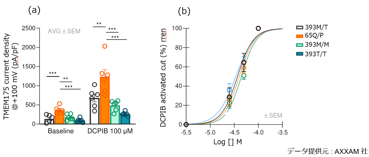 リソソームパッチクランプによる伝導度の比較および TMEM175 作動薬 DCPIB への応答性。リソソームパッチクランプにより、65Q/P 変異モデルは DCPIB (100 mM) の未処置時および処置時の両方において最も高い伝導度を示した一方 (a)、DCPIBに対する各変異モデルの反応性については有意な差がありませんでした (b)。