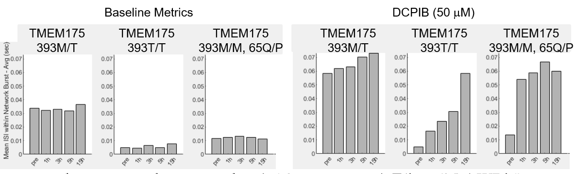 393M/T モデル、393M/M モデル、65Q/P モデルにおける、DCPIB (50 mM) 処置後の平均発火間隔変化。65Q/P 変異モデルでは処置後 1 時間で顕著な平均発火間隔の増加が観察されたのに対し、393T/T 変異モデルでは処置後 15 時間で顕著な増加が観察されました。