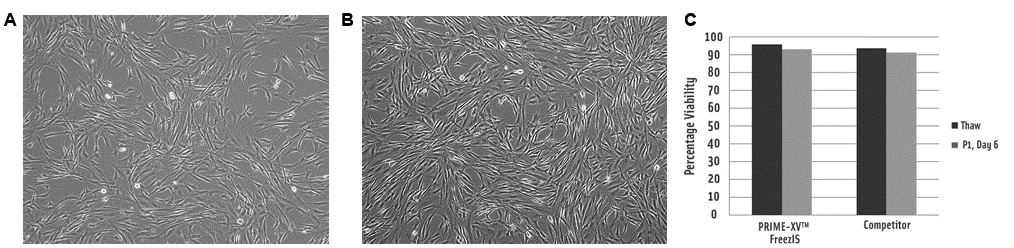 こちらの写真は、PRIME-XV MSC Expansion SFM PN# 91135で6日間培養したヒト脂肪由来間葉系幹細胞 (MSC) のPRIME-XV FreezIでの凍結保存前 (A) と凍結保存後 (B) です。また、同細胞は、PRIME-XV FreezIで凍結保存され、解凍後および培養6日後に高い生存率を示しました (C)。