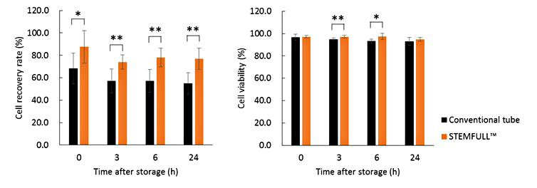 細胞保存液セルストアWまたはセルストアSに懸濁したhAD-MSCsをステムフル®で5 ℃保存することにより、汎用遠沈管で保存するよりも細胞回収率が高値に維持された。