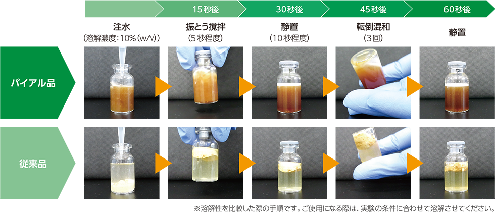 従来の10 g包装品に比べ、バイアル品は溶解性を改善し作業性・操作性を向上させております。