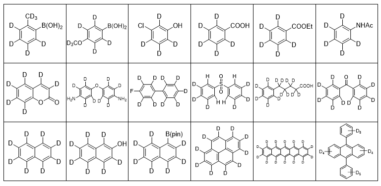 当社では重水素を導入した各種芳香族化合物をはじめとするいくつかの化合物をラインアップしています。また、特定の化合物の重水素化をご希望されるお客様に対して、受託合成サービスをご提案しています。本技術は当社で開発した技術であり、重水素交換反応によって、広範な重水素化合物を安価かつ大量に提供できます。是非とも当社と新しい用途を開拓してみませんか?お気軽にご相談ください。