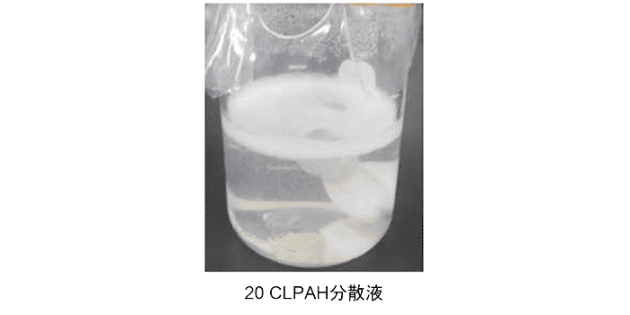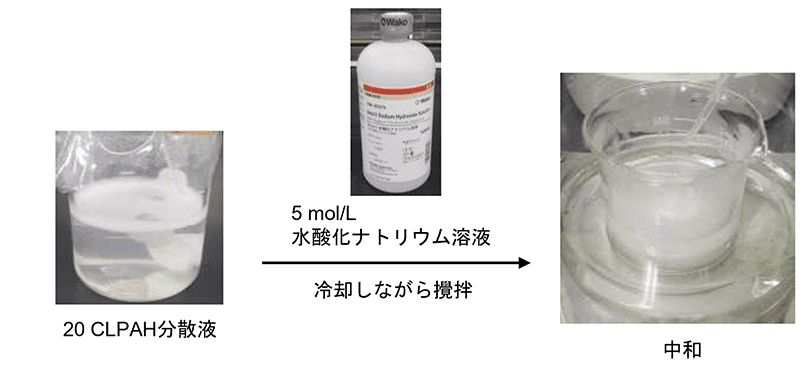 (1) 20 CLPAH分散液を冷却、攪拌しながら5 mol/L水酸化ナトリウム溶液をゆっくりと滴下します。中和による発熱がありますので、十分に注意してください。