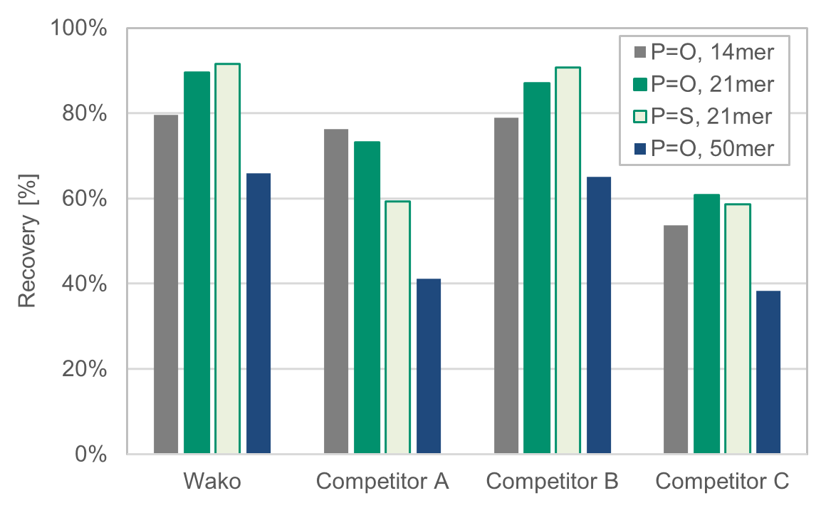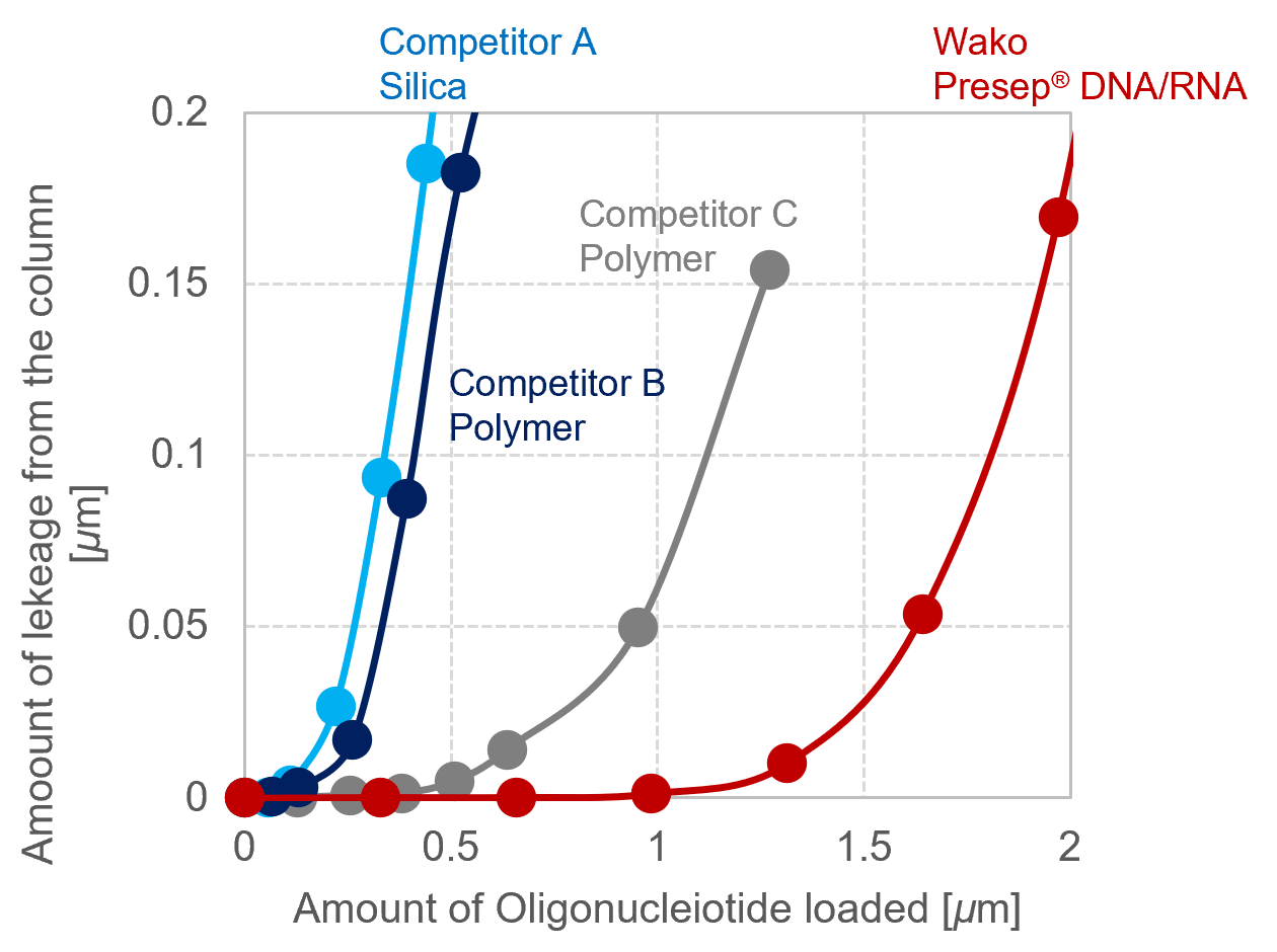Wako 品は、担体の細孔径を中分子に最適化することで、オリゴ核酸を他の製品と比べて 2~5倍効率的に保持できるよう設計されています。この特性により、精製回数や溶媒使用量を大幅に削減することが可能です。
