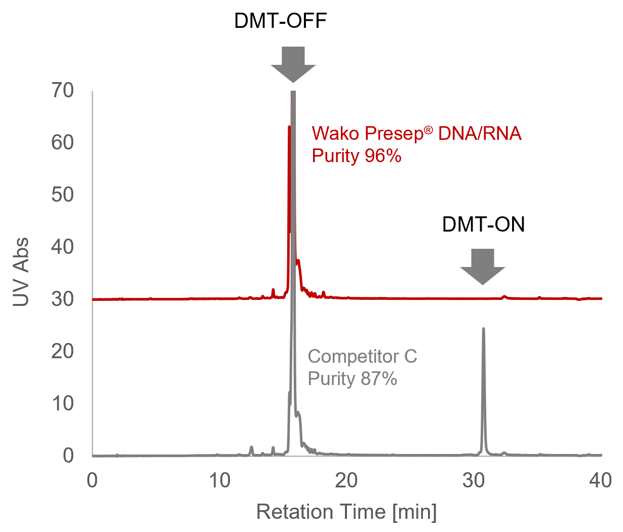 他社品Cと比較した結果、Wako品では脱保護未完体が残存しないことを確認しています。これはシリカゲルの非膨潤性により、DMT基の脱保護反応の効率が向上するためです。