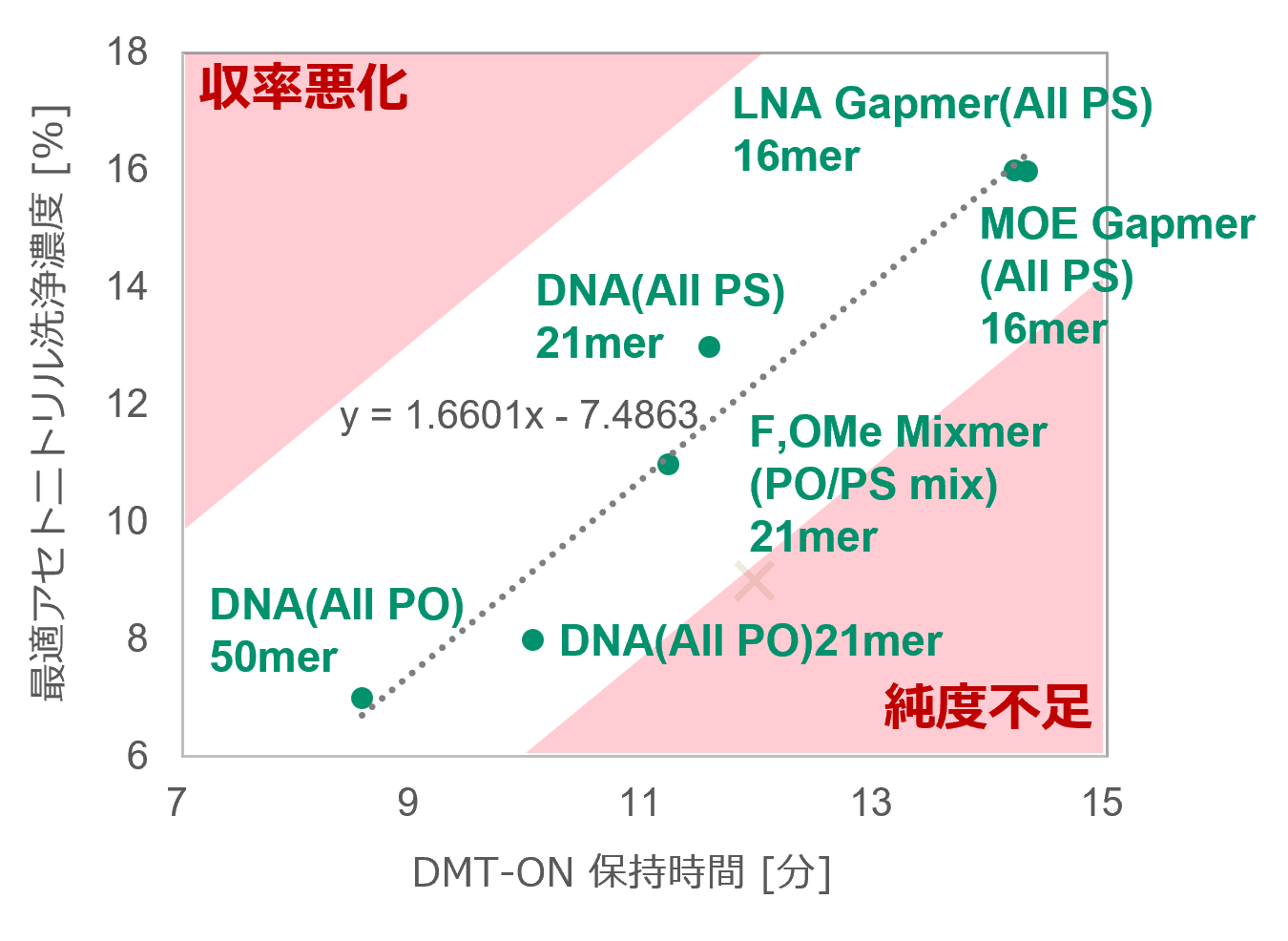 DMT-ON体保持時間と最適なアセトリル洗浄濃度の相関性