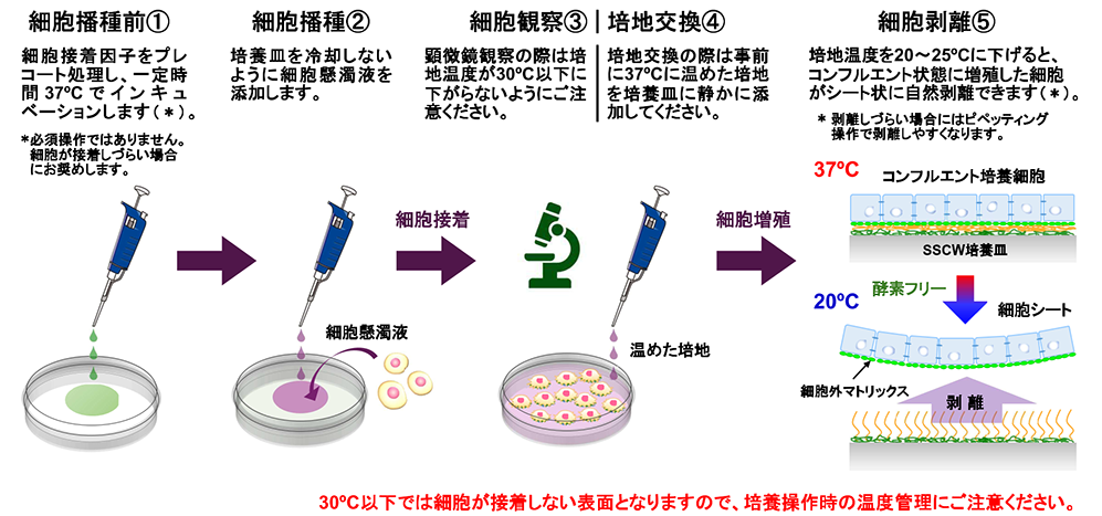 | SSCW® | 37℃で培養後に、室温(20-25 ℃)で細胞シートを剥離回収することができます。 | 細胞種、細胞播種数、培地組成などの培養条件によって、接着性や剥離性が異なる場合がございます。(※) |