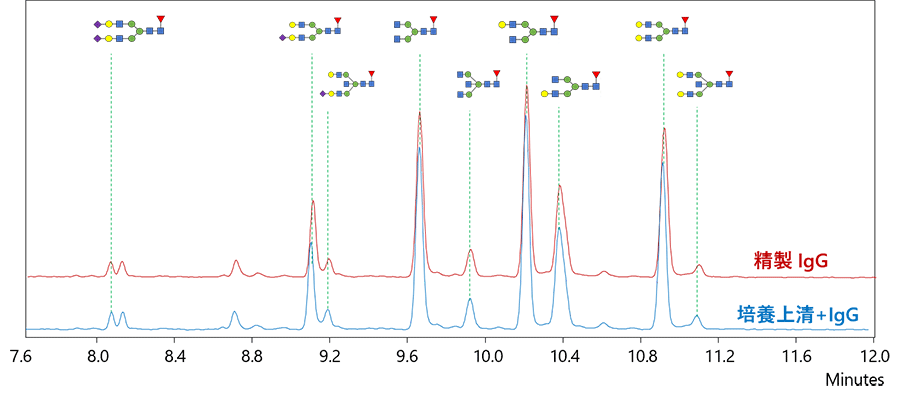ヒトIgG (40 μg) を HEK293 細胞の培養上清 (120 μL) にスパイクした溶液を EZGlyco® mAb-N Kit with APTS を用いて処理し、APTSラベル化N型糖鎖サンプルを調製した。コントロールとして精製IgGを同様に処理した。