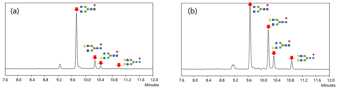 (a) Trastuzumab deruxtecan および (b) Trastuzumab emtansine (各40 μg, いずれも市販品) をEZGlyco® mAb-N Kit with APTS を用いて処理し、 N型糖鎖サンプルを調製、表面記載の条件でCE分析を行った。