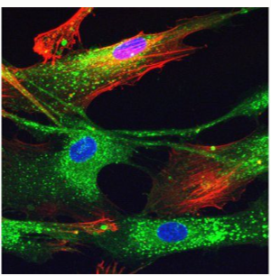 Blue: nuclei, red: fibronectin, green: DIVTECH.