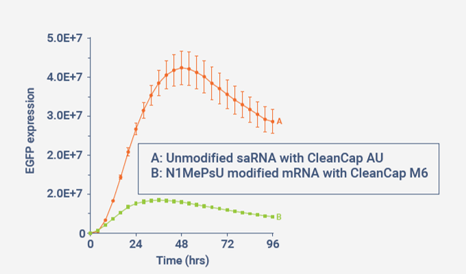 TriLink 社の CleanCap® saRNA は、アルファウイルス配列(非構造タンパク質 nsp1-4 を含む)を含有しており、自己増殖により持続的なタンパク質発現を実現します。これにより、最小限の RNA から高濃度の抗原や治療用タンパク質を産生することが可能です。投与量が少ないため、self-amplifying RNA (saRNA) はワクチンや遺伝子療法において特に優れており、従来の mRNA 手法と比較して強い免疫応答を誘導し、有効性を向上させます。