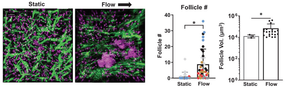 培地の灌流は、リンパ組織チップにおいて濾胞の形成を誘導します。